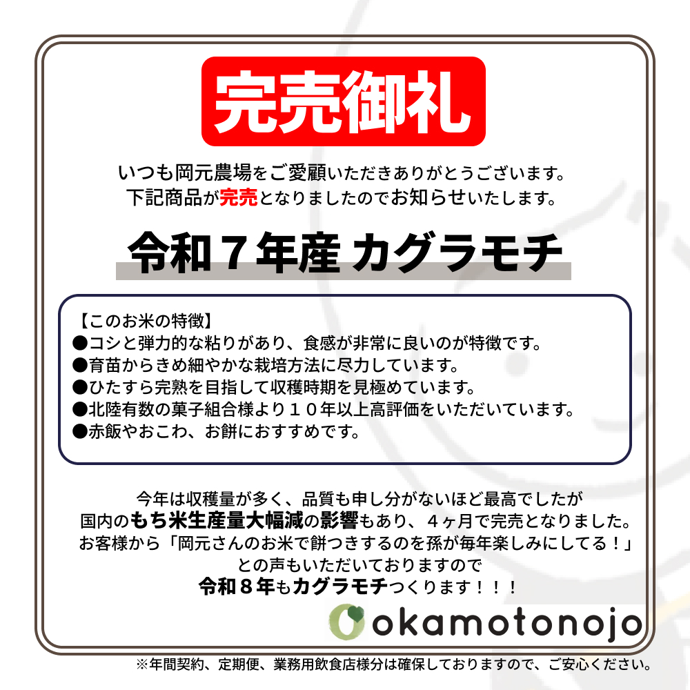 この度、カグラモチが完売となりましたのでご案内いたします。