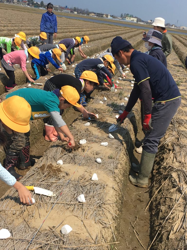 4月14日金曜日、絶好のお天気に恵まれて、加賀丸いも植え付け最終日は地元福岡小学校3年生と一緒に終えました。