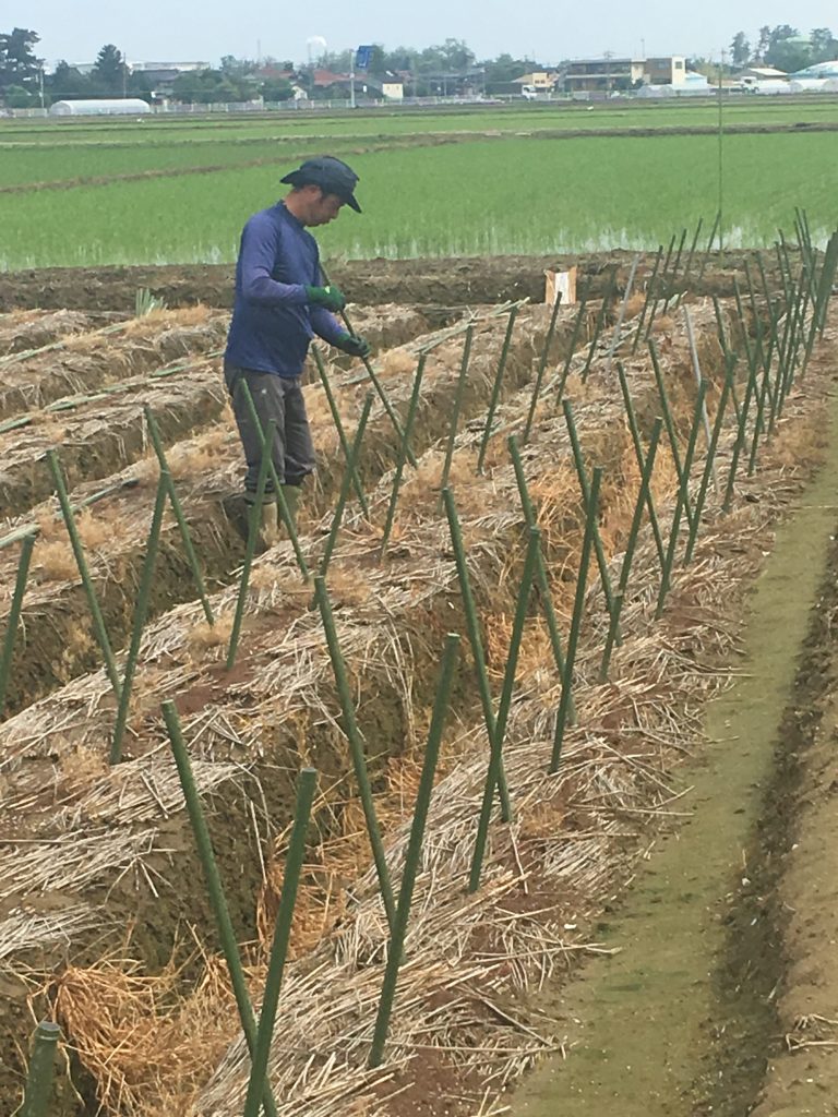 数日前に畝上に配り終えた支柱を一本一本手で、腕で、肩でしっかりとさします。この作業もかなりの重労働です。今はまだ発芽前ですが、発芽して、ツルが伸び葉が茂ったときに、台風が来ても倒れないように畝にしっかりと固定されるようにします。