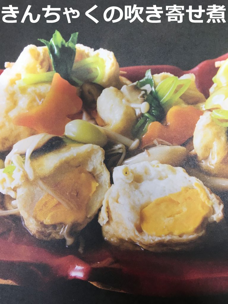③油揚げを半分に切り、袋状にする。その中に①の昆布と②、卵黄を割らずに入れて、つまようじで止める。