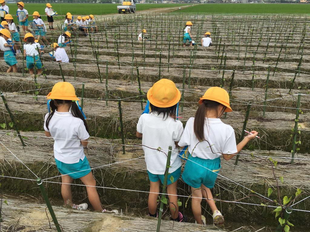 6月22日に能美市立福岡小学校三年生達が加賀のまる芋畑へ観察にやって来ました。
