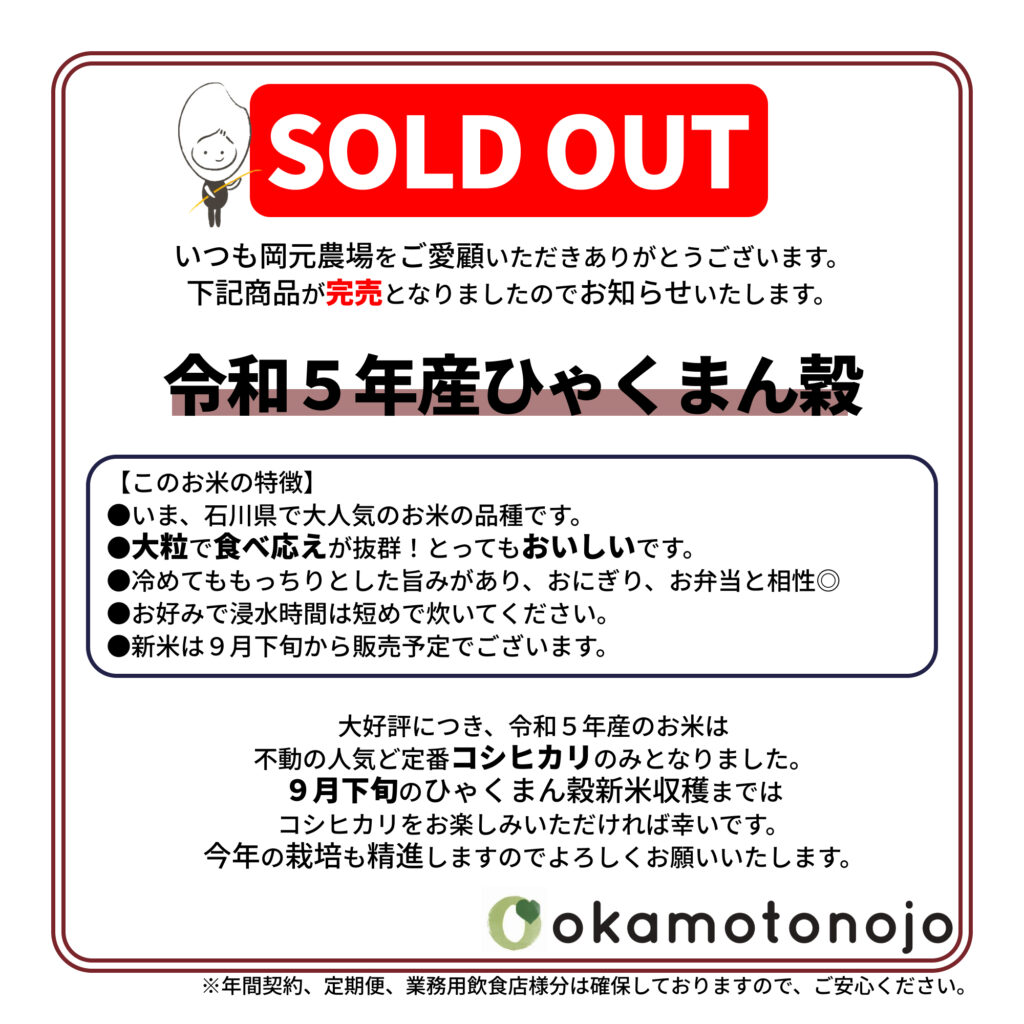 ひゃくまん穀は売り切れましたがコシヒカリはまだ在庫がございます!9月下旬のひゃくまん穀の新米収穫までは絶大な人気のコシヒカリをお楽しみいただければ幸いです。今年の栽培も精進しますのでよろしくお願いいたします。
