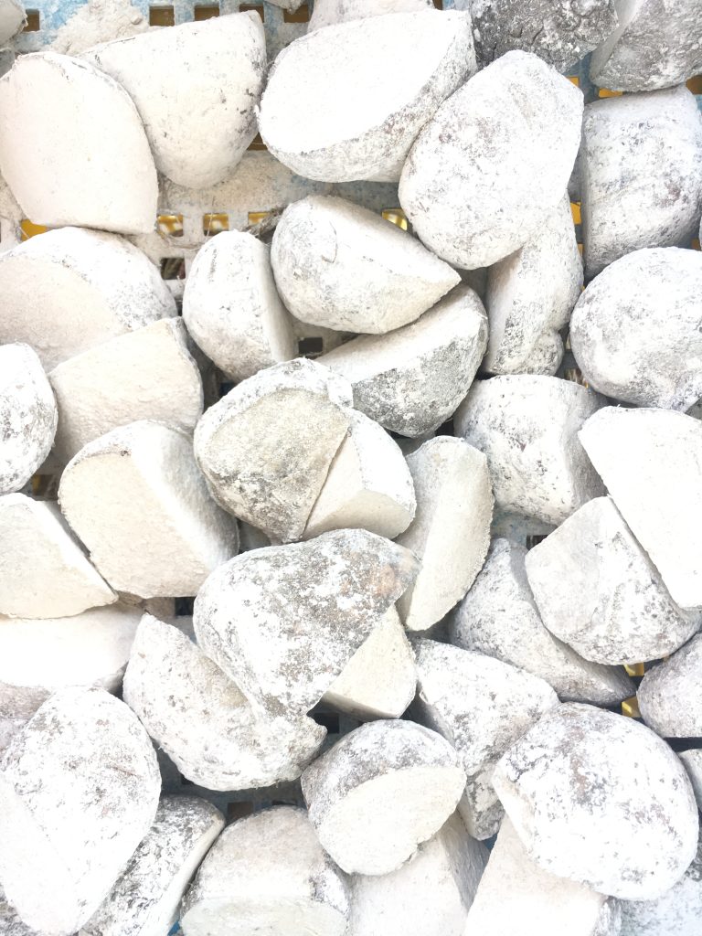 種いもは頂芽(とがったところ)を取り除いて、60g(卵一個程度)の大きさに切り分けたものに、消石灰をまぶして乾燥させます。