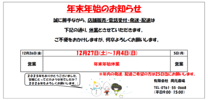 NEWS 2025年→2026年【年末年始のお知らせ】 こんにちは!おいしいお米と加賀丸いもの岡元農場です!寒くなってきましたが、皆様いかがお過ごしでしょうか?2025年→2026年の年末年始のご案内です(^^)/誠に勝手ながら、店舗販売・電話受付・発送・配達は下記の通り、休業とさせていただきま... NEWS