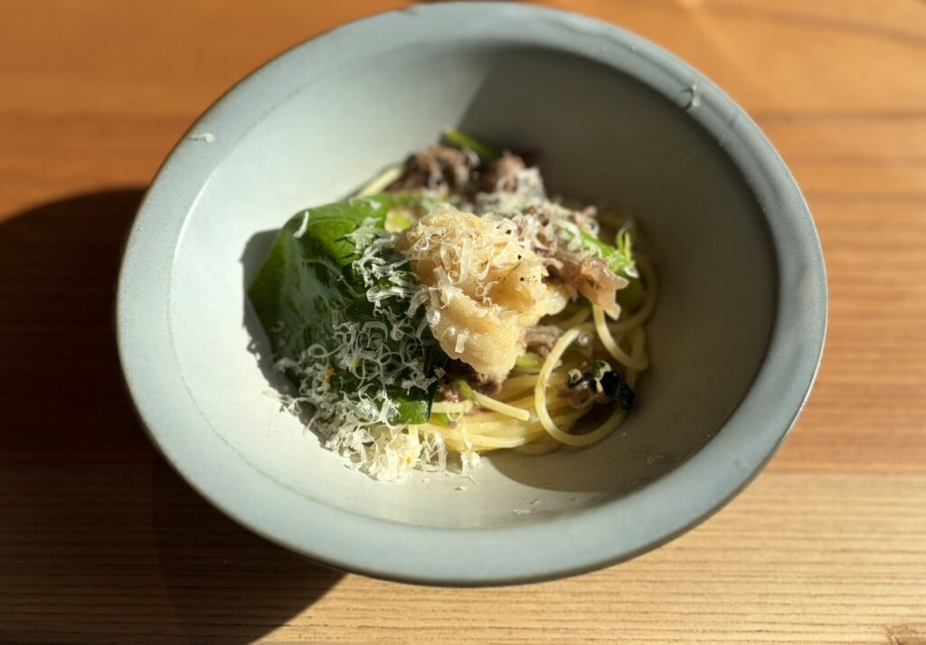 鹿肉とほうれん草のパスタ(加賀丸いものニョッキを乗せて)
