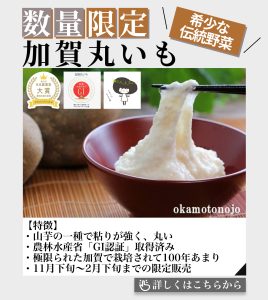 ・「加賀丸いも」は能美市に伝来100年。高い栄養価と強い粘りが最大の特徴です。